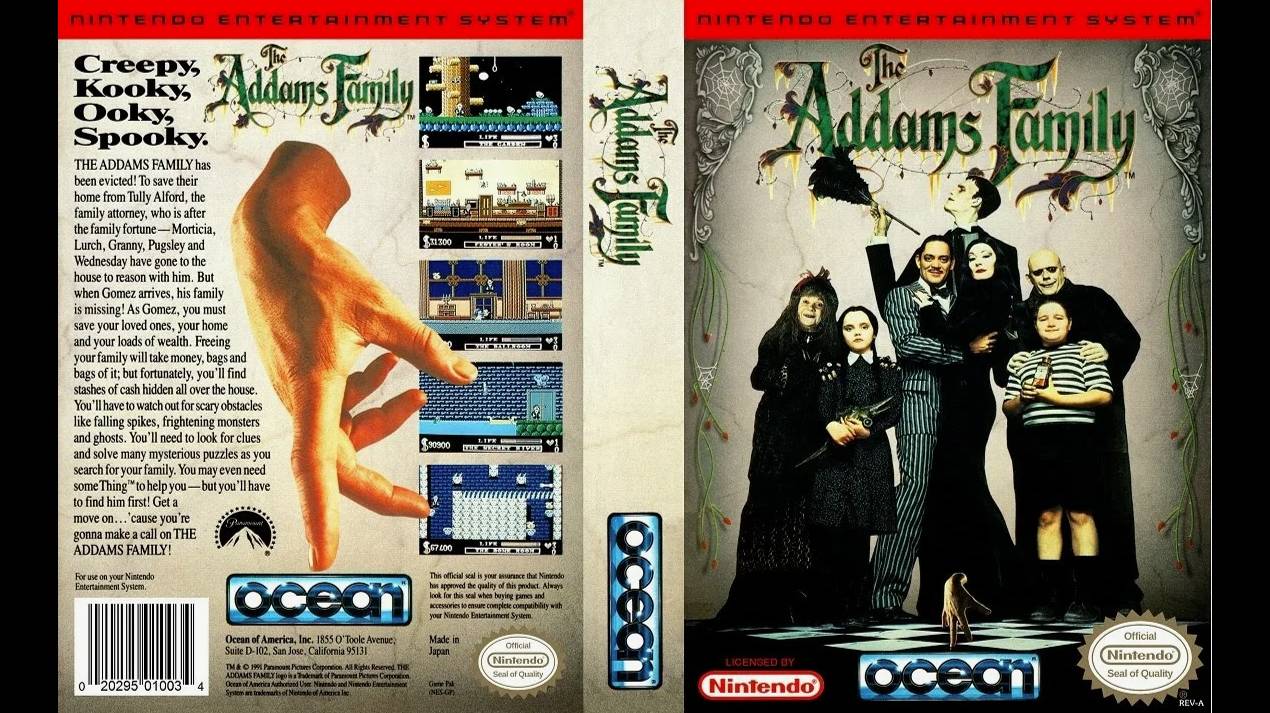 "THE ADDAMS FAMILY" - видеоигра жанра платформер, выпущенная OCEAN SOFTWARE в 1992 году. Изначально игра вышла на SEGA MEGA DRIVE, SUPER NES, а уже позже на NES, SEGA MASTER SYSTEM. Игра основана на одноимённом фильме 1991 года. Действие игры происходит от лица главы семейства - Гомеса Адамса, цель которого - найти остальных членов семьи. Все они, кроме Вещи (Thing) и дворецкого Ларча, были похищены и спрятаны в многочисленных комнатах большого особняка. Игра не разбита на уровни в привычном смысле этого слова, главный герой волен передвигаться по этажам и комнатам здания практически в любом порядке. Главное - иметь ключ, открывающий доступ в комнату или чердак. Особняк полон всяческих секретов, ловушек и врагов - всевозможных зверей, оживших предметов и летающих черепов. Оружия как такового у Гомеса нет, вместо этого для ликвидации врага нужно прыгнуть на него сверху. Кроме того, по игре разбросаны бонусные предметы: пачки долларов, слитки золота и драгоценные камни. Количество собранного отображается в углу экрана. В игре для NES требовалось набрать 1 000 000 $, чтобы освободить свою жену Мортишу.