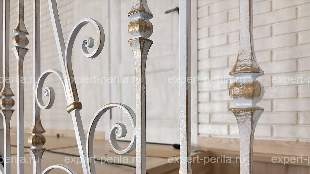 Перила для лестницы в технологии художественной ковки. Стиль — светлая классика с утончёнными завитками и аккуратными балясинами, гармонично вписанная в современный интерьер. Воздушный рисунок и мягкий оттенок металла создают элегантный, статусный акцент на всей лестничной группе. Состав изделия — Начальные и промежуточные столбы квадратного сечения с декоративными навершиями — Наклонный металлический поручень по линии марша — Верхний продольный пояс с плавным сопряжением на повороте — Вертикальные балясины с декоративными утолщениями и кольцевыми элементами — Кованые S- и C-образные завитки между стойками — Поворотная секция ограждения на площадке второго уровня — Нижняя направляющая, повторяющая линию лестницы — Крепления к ступеням и перекрытию — Отделка: светлая окраска с лёгкой серебристой патиной, матовая поверхность Геометрия Пропорции вытянутые, с равномерным шагом балясин вдоль марша. Формы — плавные S- и C-завитки, полукруглые спирали, прямые вертикали. Узор ритмичный, с повторяющимися завитковыми вставками между стойками. Композиция симметричная в секциях, с аккуратным переходом на площадке. Рисунок, стиль, аудитория — Рисунок: ритмичный орнамент «балясина-завиток» с равномерным декоративным заполнением. — Стиль: классическая художественная ковка в светлом исполнении. — Подходит идеально: владельцам загородных домов и просторных таунхаусов, ценители светлой классики и аккуратной декоративности. Светлые кованые перила, которые делают лестницу визуально лёгкой и подчёркивают архитектуру пространства. Индивидуальное проектирование рисунка и конфигурации под конкретную геометрию марша и площадки. Планируете оформить лестницу в светлой классике? Пришлите фото объекта и размеры — подготовим бесплатный расчёт и эскиз перил под ваш проект.