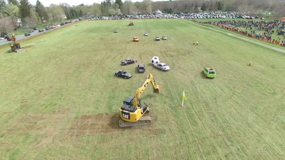 Видео с третьей ежегодной игры по авто соккеру. Мяч достигает 8 футов в диаметре, а вместо вратарей используются экскаваторы.
