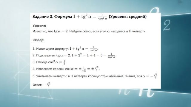Основное тригонометрическое тождество: sin²α + cos²α = 1. Вывод и следствия. Зависимости: tg α = sin α / cos α, ctg α = cos α / sin α, tg α · ctg α = 1. Формулы, связывающие тангенс и косинус, котангенс и синус: 1 + tg²α = 1/cos²α, 1 + ctg²α = 1/sin²α. Вывод и применение . Подготовка и обучение школьников с помощью ИИ: https://sdavalka.ru/. Как работать? - Зарегистрируйтесь. - Найдите нужный предмет и класс. - Изучите материалы по урокам: текст, понятный ученикам, сжатый видеоурок с ИИ. - Пройдите тренировочный тест (можно проходить бесконечно, для усвоения материала). - Уверены, сдавайте экзаменационный тест! - И так по каждой теме. - В конце итоговый тест. - Сдадите все - сдадите любой экзамен! Системы дистанционного образования, контент: https://ecre.ru/ Подготовка для ВУЗов и СУЗов: https://mexam.ru/