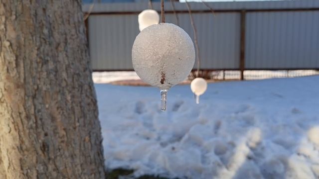 Дочка накануне игралась со снежколепом, ночью был мороз, шарики снежные не растаяли. А вот утром выглянуло тёплое солнышко и снежки начали таять и падать с веток...
