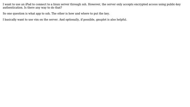 Apple: How to ssh with public-key on an iPad? Helpful? Please support me on Patreon: https://www.patreon.com/roelvandepaar With thanks & praise to God, and with thanks to the many people who have made this project possible! | Content (except music & images) licensed under CC BY-SA https://meta.stackexchange.com/help/licensing | Music: https://www.bensound.com/licensing | Images: https://stocksnap.io/license & others | With thanks to user xiaohuamao (apple.stackexchange.com/users/284629), user bmike (apple.stackexchange.com/users/5472), and the Stack Exchange Network (apple.stackexchange.com/questions/358718). Trademarks are property of their respective owners. Disclaimer: All information is provided "AS IS" without warranty of any kind. You are responsible for your own actions. Please contact me if anything is amiss at Roel D.OT VandePaar A.T gmail.com