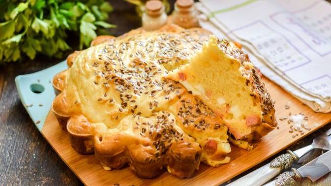 Начинка из колбасы, сыра и варёных яиц заливается тестом, Пирог получается сытным и питательным, годится в качестве самостоятельного блюда или дополнения к супам и напиткам.