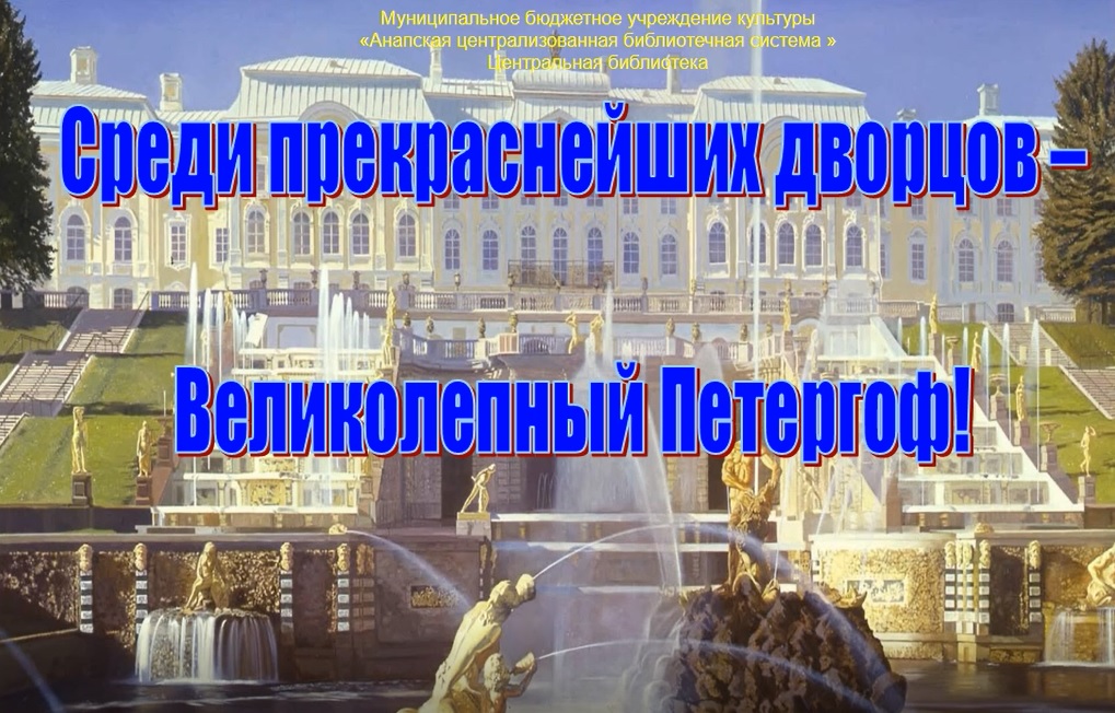 История государственного музея заповедника — Петергоф неразрывно связана с историей России. Петергоф на протяжении 200 лет был парадной летней резиденцией Российских императоров. Приморский парадиз строился как грандиозный триумфальный памятник, прославляющий величие России. Архитектурно-парковый ансамбль это симбиоз архитектурной мысли и природной красоты. Занесен в список всемирного наследия ЮНЕСКО и по праву входит в число семи чудес России. В рамках Всероссийской акции «Ночь музеев» предлагаем вам виртуальную прогулку по дворцово-парковому ансамблю. Подготовила гл. библиограф отдела обслуживания МБУК Анапская ЦБС Кудрявцева Л.П.