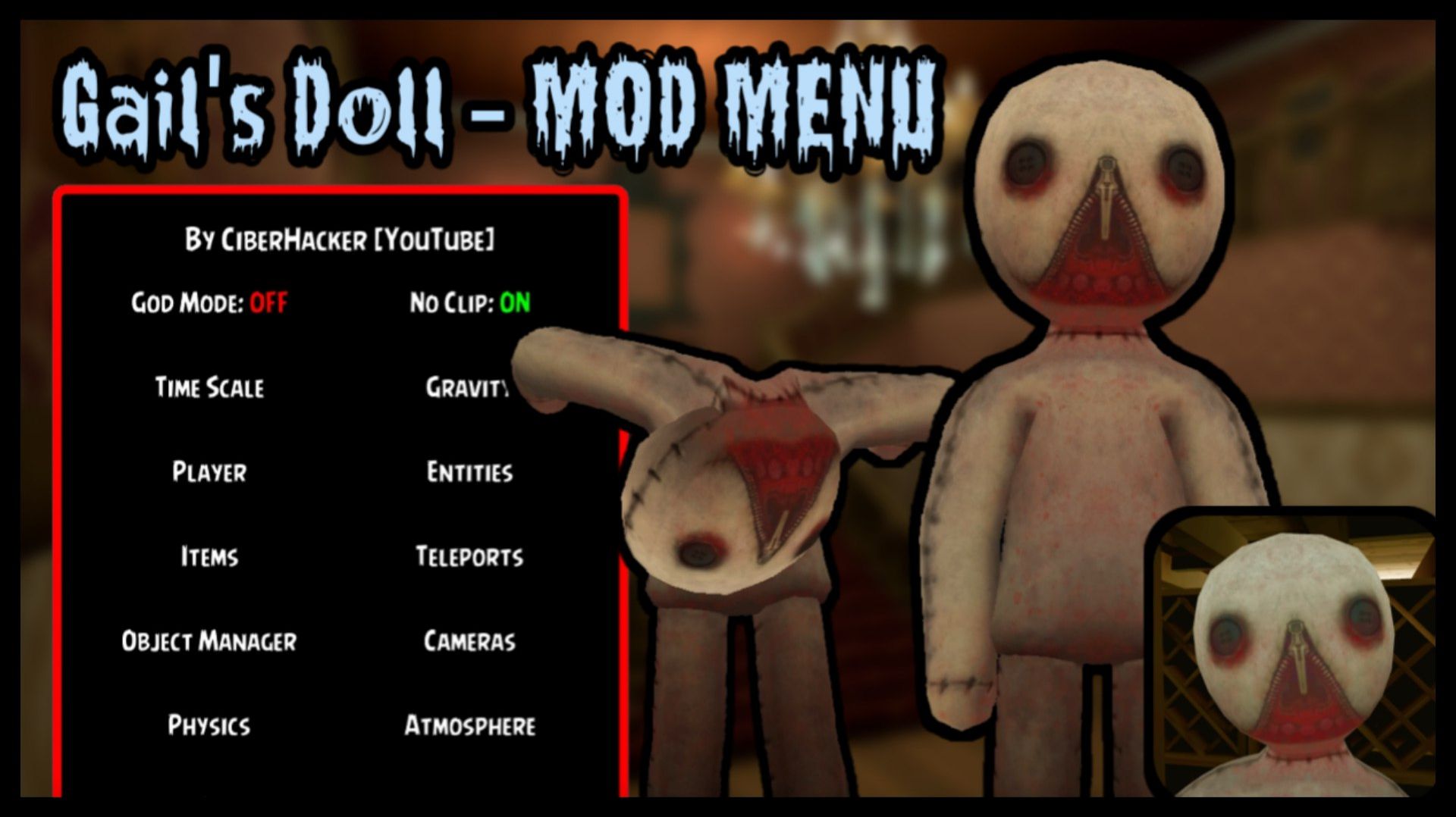 Gail's Doll ⚠️ Mod Features ⚠️ ✅ God Mode ✅ No Clip ✅ Time/Gravity Control Player ✅ Coords, Scale, Speed, No Clip Speed Enemies ✅ Size, Stop, Kill, Clone, ESP, Camera Items ✅ Select, Get Teleports ✅ Checkpoint, Teleport, Where to Objects ✅ Select, Destroy, Clone, Size, Pos/Rot, ESP Cameras ✅ Create, Select, FOV, Clip Planes, Ortho, Pos/Rot Physics ✅ Add, Mass, Gravity, Kinematic Atmosphere ✅ Fog (Distance, Color), Ambient Color Mod Links ✅ In the pinned comment