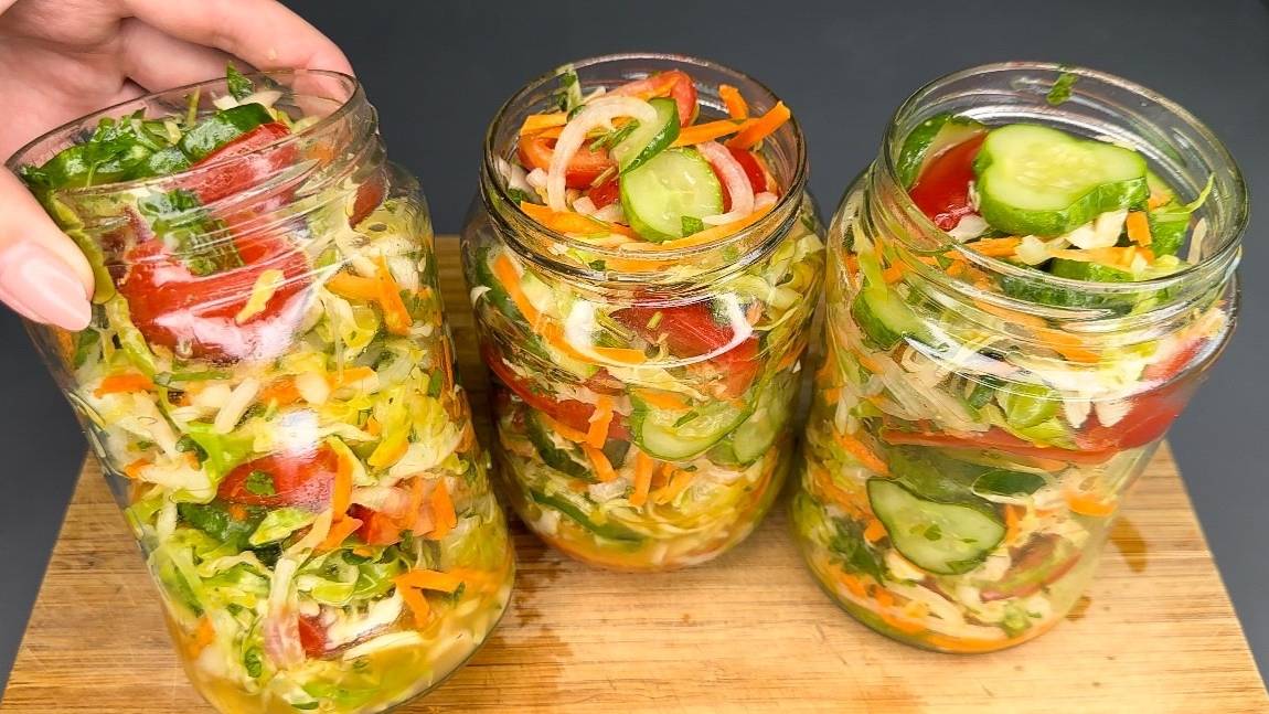 Ингредиенты: 1. Помидоры - 700 гр. 2. Огурцы - 700 гр. 3. Капуста - 350 гр. 4. Репчатый лук - 300 гр. 5. Морковь - 200 гр. 6. Петрушка. 7. Острый перец - по вкусу. 8. Соль - 2 ст. ложки. 9. Сахар - 80 гр. 10. Уксус 9% - 60 мл. 11. Растительное масло - 100 мл. Приятного аппетита!