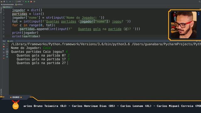 Exercício Python 093: Crie um programa que gerencie o aproveitamento de um jogador de futebol. O programa vai ler o nome do jogador e quantas partidas ele jogou. Depois vai ler a quantidade de gols feitos em cada partida. No final, tudo isso será guardado em um dicionário, incluindo o total de gols feitos durante o campeonato. Veja o curso de Python PARTE 1 em https://www.youtube.com/playlist?list=PLHz_AreHm4dlKP6QQCekuIPky1CiwmdI6 Veja o curso de Python PARTE 2 em https://www.youtube.com/playlist?list=PLHz_AreHm4dk_nZHmxxf_J0WRAqy5Czye Veja o curso de Python PARTE 3 em https://www.youtube.com/watch?v=0LB3FSfjvao&list=PLHz_AreHm4dksnH2jVTIVNviIMBVYyFnH Veja a lista de exercícios de Python em https://www.youtube.com/playlist?list=PLHz_AreHm4dm6wYOIW20Nyg12TAjmMGT- Gostou da aula? Então torne-se um Gafanhoto APOIADOR do CursoemVídeo acessando o site cursoemvideo.com/apoie Aula do Curso de Python criado pelo professor Gustavo Guanabara para o portal CursoemVideo.com. Curso em Vídeo Seja um apoiador: http://cursoemvideo.com/apoie Site: http://www.cursoemvideo.com YouTube: http://www.youtube.com/cursoemvideo Facebook: http://www.facebook.com/cursosemvideo Twitter: http://twitter.com/cursosemvideo Google+: http://plus.google.com/112666558837414979080 Patrocínio HOSTNET: http://www.hostnet.com.br GAFANHOTOS: http://apoie.me/cursoemvideo