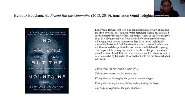 The activity of reading gives us powerful ways of posing and exploring important questions about human rights, representation and justice today. Reading invites us to think together. In this talk to the Oxford Postcolonial Writing and Theory seminar on 4 May 2021, Lyndsey Stonebridge offers readings from three texts to think about the different timelines—a time of exile, a moment of devastation, a time of waiting without end—that narrative and poetry invite us into. Looking at Eric Auerbach’s Mimesis, Mahmood Darwish’s Memory for Forgetfulness, August, Beirut, 1982, and Behrouz Boochani’s No Friend But the Mountains, she argues that writing can help us to relate better to other human life-times. Lyndsey was speaking about her 2020 collection of essays Writing and Righting: Literature in the Age of Human Rights (Oxford UP) in which she makes the case for a renewed collaboration between the work of writing and the politics of human rights. -- Lyndsey Stonebridge is Interdisciplinary Professor of Humanities and Human Rights at the University of Birmingham, UK. Her other recent books include: Placeless People: Rights, Writing, and Refugees (OUP, 2018), winner of the Modernist Studies Association Best Book Prize, 2019, and The Judicial Imagination: Writing after Nuremberg (Edinburgh University Press, 2011). She is currently writing a book, Thinking with Hannah Arendt, which will be published by Jonathan Cape in 2022.