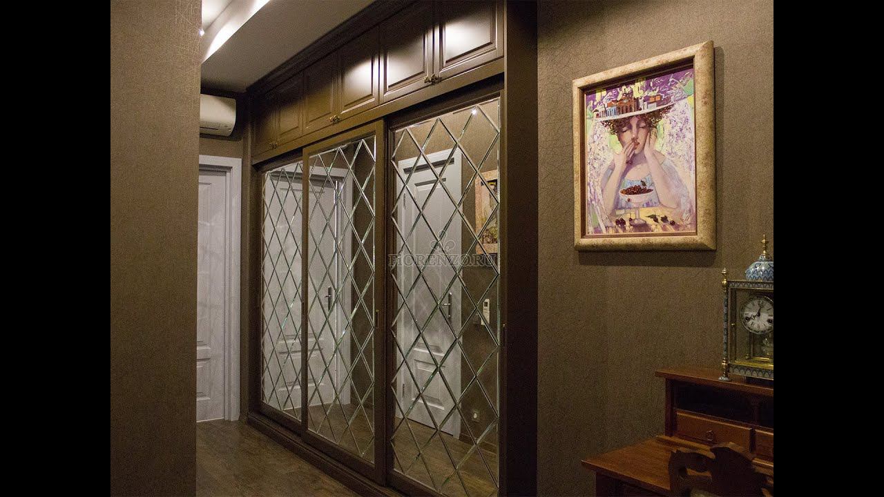 Зеркальный шкаф-купе встроенный в нишу. Фрезерованные фасады с фацетным панно окрашены эмалью. Проект с индивидуальным дизайном и наполнением. https://fiorenzo.ru/katalog/298/
