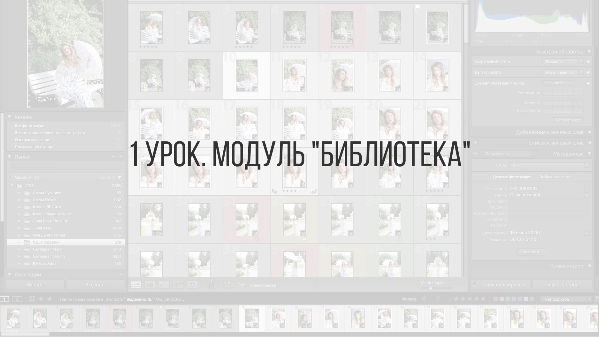 Видео является частью моего нового курса по ретуши и цветокоррекции 2026 года "Ретушер 2.0": https://www.ekaterinanasyrova.ru/retouchingcourse Переходите по ссылке, чтобы пройти ознакомительный урок "Знакомство с Lightroom" полностью: https://www.ekaterinanasyrova.ru/retusher-20-2026-znakomstvo-s-obucheniem Библиотека - это модуль, в который мы попадаем после открытия Lightroom Classic. В библиотеке мы можем: - импортировать новые съемки; - просматривать папки со съемками; - просматривать и сортировать съемки по отдельности; - применять пресет ко всей съемке сразу; - выделять одну или несколько фото и делать их цветокоррекцию - экспортировать съемки в jpeg формат с единым размером фото для всей съемки.