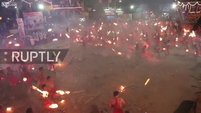 Сотни индуистов собрались на фестиваль Агни Кели, который проходит в Мангалоре. Верующие разделяются на две группы и начинают бросать горящие факелы из пальмоых ветвей друг в друга. Таким образом они успокаивают индуистскую богиню Дургу.