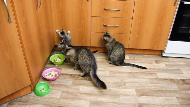 Кошка мама с котятами на кухне играют с лучом лазерной указки. На заднем плане мурлыкает кошка у меня на руках.