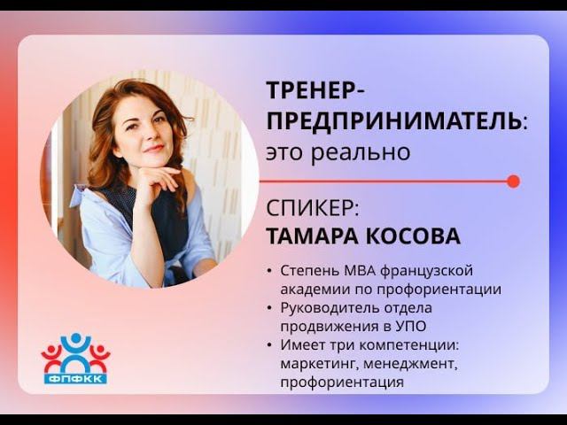 ТЕМА: Тренер-предприниматель - это реально ⏩ Поговорим про рост фитнес-инструктора вне клубной системы: - Как выбрать работать в найме или «на себя» - Принципы построения карьеры при работе «на себя» - С чего начать и как масштабировать - Как и за счет чего увеличить доход Спикер Тамара Косова @tamarakosova Эксперт по профориентации Степень МBA французской академии по профориентации Автор интенсива «Переход из оффлайн в онлайн» Руководитель отдела продвижения в УПО Имеет три компетенции: маркетинг, менеджмент, профориентация Хотите получить бонус? напишите в телеграмм хочу разбор личности https://t.me/fit_sandul_anna НАЙДИТЕ НАС В СОЦИАЛЬНЫХ СЕТЯХ: ВКонтакте: https://vk.com/fpfkk https://vk.com/fpfkk_crimea Telegram: https://t.me/fpfkk НАШЕМУ КАНАЛУ НУЖНА ВАША ПОМОЩЬ: Поставь лайк, напиши комментарий, добавь видео себе в плейлист, поделись им в соц. сетях - ЭТО ОЧЕНЬ ВАЖНО!