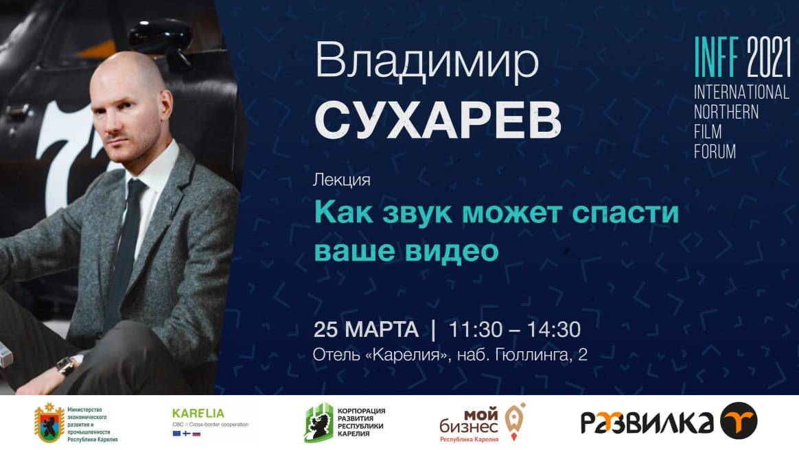 Владимир Сухарев Telegram: https://t.me/whispersound В 2021г. выступил в прямом эфире на Международном кинофоруме «INFF 2021 Кино Карелии», в г. Петрозаводск. INFF - International Northern Film Forum. Большое спасибо организаторам за приглашение, было очень приятно! Поделился всем опытом и своим подходом в звукорежиссуре кино, дизайне звука, записи звука на площадке.