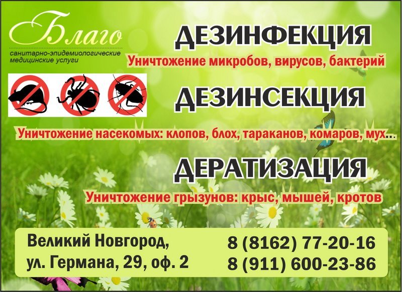 Дезслужба "Благо": дезинфекция, борьба с грызунами и насекомыми в Великом Новгороде и Новгородской области. Дезслужба "Благо" окажет все виды экологических услуг частным лицам и организациям в Великом Новгороде и Новгородской области. Проводим профессиональную дезинфекцию: - Уничтожение микробов, вирусов, бактерий. - Услуги по комплексной дезинфекции вентиляции и кондиционеров, дезинфекция авто. Проводим профессиональную дератизацию: - Уничтожение грызунов: крыс, мышей, кротов. Проводим профессиональную дезинсекцию: - Уничтожение ползающих и летающих насекомых: клопов, тараканов, блох, моли, клещей, комаров, муравьев, мух, ос, пчёл, шершней, огневки. Дезинфекционные мероприятия проводятся на высоком профессиональном уровне, с применением только качественных современных препаратов, с минимальным вредом для экологии, людей, домашних животных и помещения. 173002, г. Великий Новгород, ул. Германа, д. 29, офис № 2. Приём заявок: С 8-00 до 17-00 по тел. 8 (8162) 77-20-16 С 8-00 до 22-00 по тел. +7 911 600-23-86 Email: info@ooo-blago.ru Сайт: ooo-blago.ru В Интернете (в поисковиках) нас находят, в частности, по таким словам: дезинфекция Великий Новгород, борьба с грызунами Великий Новгород, борьба с насекомыми Великий Новгород, дезинфекция Новгородская область, борьба с грызунами Новгородская область, борьба с насекомыми Новгородская область. #дезинфекция #ВеликийНовгород #борьбасгрызунами #Новгородскаяобласть