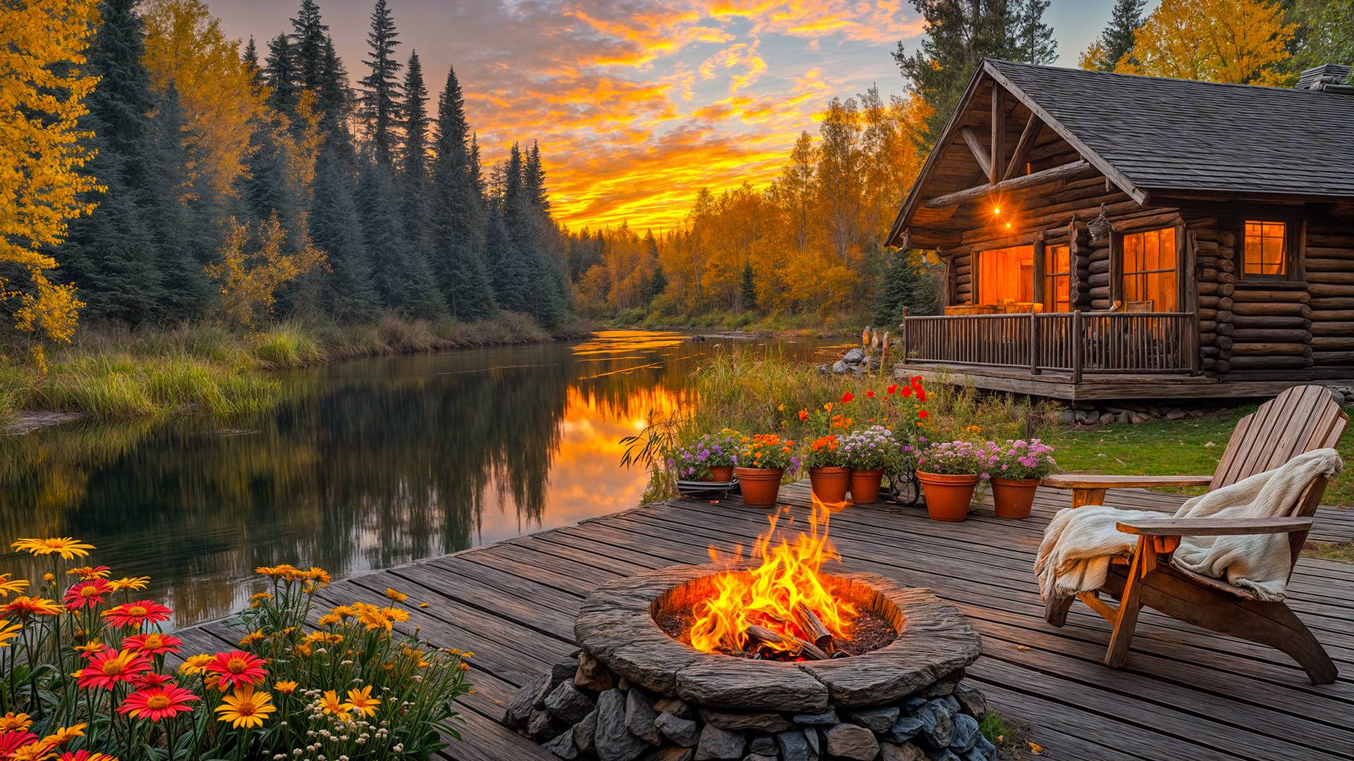 Уютная атмосфера осеннего заката 🍂 Треск Костра, пение птиц, шум воды и осенние звуки природы