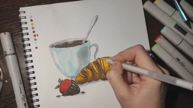 Как нарисовать кофе и круассан маркерами урок №38