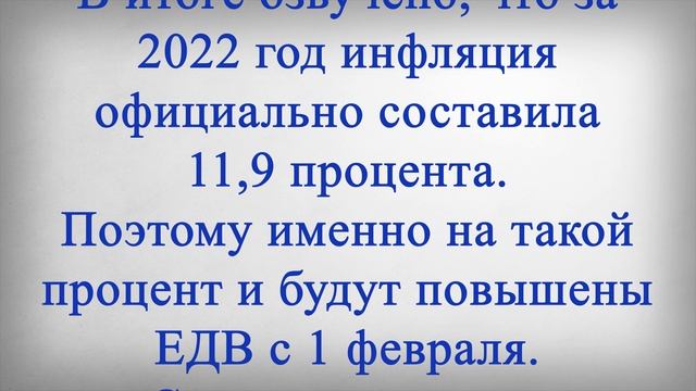 Новый Размер Пенсий с 1 Февраля! Российским пенсионерам рассказали об изменении размера выплат с февраля. Пенсии придут в другом размере в следующем месяце уже многим пожилым гражданам. И для некоторых из них процент изменений стал известен только сейчас. Изменение размера выплат с февраля затронет многих пожилых граждан. В первую очередь нововведение ожидается для тех, кто является получателем ежемесячных денежных выплат, коротко именуемых ЕДВ. Речь идет о нескольких миллионах пенсионеров, а такие выплаты обычно приходят людям вместе с ежемесячной пенсией. Поскольку индексация таких выплат привязана к показателям инфляции за предыдущий год, все ждали цифр от Росстата. В итоге озвучено, что за 2022 год инфляция официально составила 11,9 процента. Поэтому именно на такой процент и будут повышены ЕДВ с 1 февраля. Соответствующее постановление правительства уже подписано. Выплаты в другом размере придут пенсионерам из числа льготников. Это ветераны, инвалиды различных категорий, участники ВОВ, чернобыльцы, родственники умерших ветеранов и инвалидов войны, а также обладатели различных почетных званий, например Герои РФ. К примеру, инвалидам первой группы с февраля будут доплачивать к пенсии по 4958 рублей, это полная сумма с учетом набора социальных услуг, а ранее речь шла о сумме в 4431 рубль. Также, в феврале пенсии в другом размере придут тем пенсионерам, которые уволились с работы в октябре прошлого года. Такие граждане получат доплату за три месяца ожидания прибавки: за ноябрь, декабрь и январь, а также всю пенсию с учетом пропущенных индексаций. Ставьте лайк если считаете, что такого повышения недостаточно и в феврале необходимо повысить пенсии всем пенсионерам, а также напишите каким, по-вашему, должно быть это повышение?