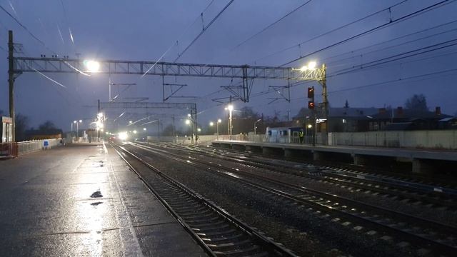 3 ноября 2021 года в 17:13 станция Вышний Волочёк Октябрьская железная дорога 2 жёлтых верхний мигающий для Сапсана из Москвы с остановкой поезд №770, а на ходу пролетает Сапсан на Москву поезд №769 Vyshny Volochyok station, 2 yellow for Sapsan and Sapsan for the passage under 200 km / h November 3, 2021 at 17:13 Vyshny Volochyok station Octyabrskaya railway 2 yellow top flashing for Sapsan from Moscow with a stop train # 770, and on the move Sapsan flies to Moscow train # 769