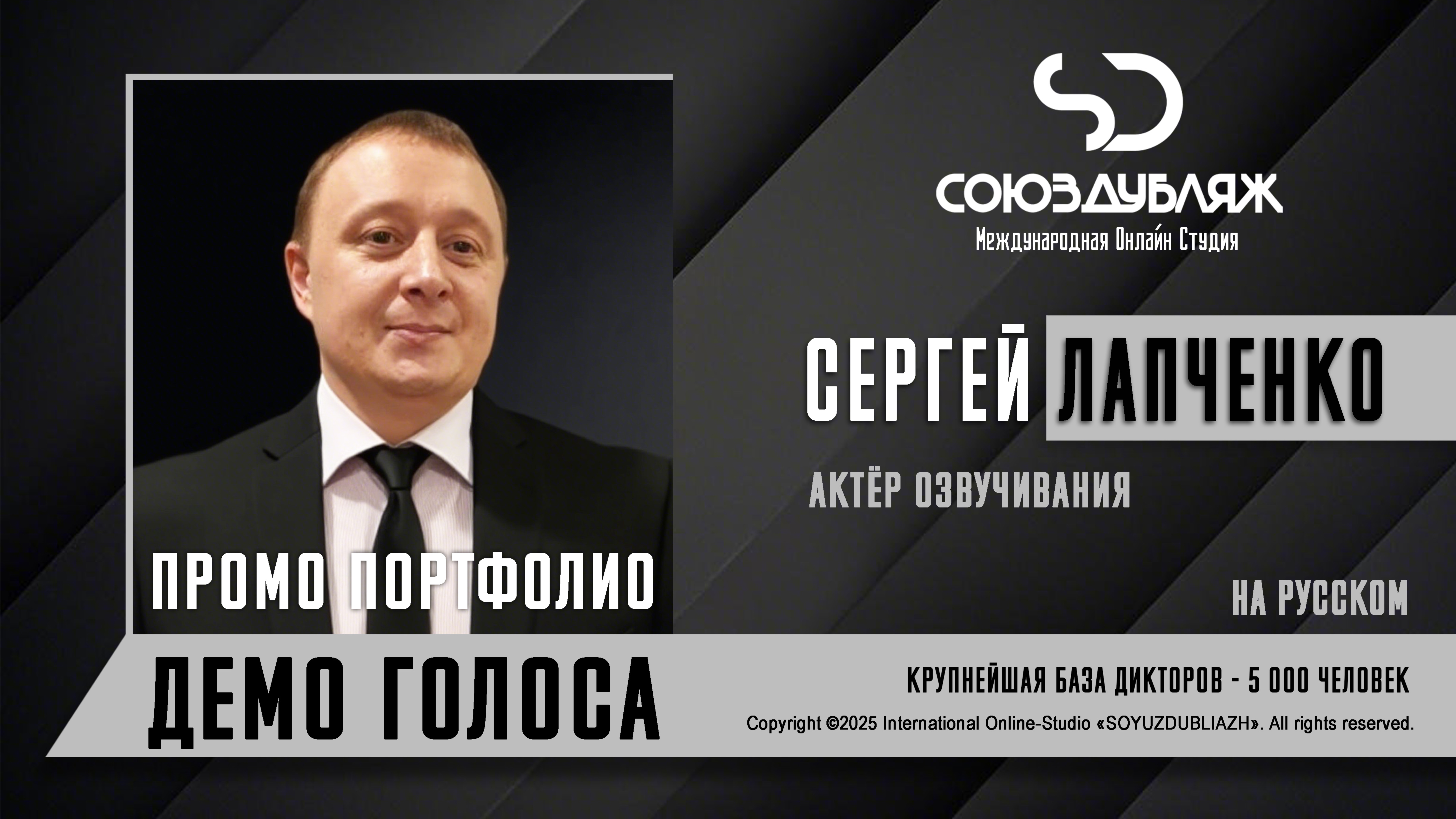 #СоюзДубляж #БазаДикторов #Озвучка ✔️Сергей Лапченко, актёр озвучивания. Международная Онлайн-Студия "СОЮЗДУБЛЯЖ" - профессиональная озвучка и дубляж. ▪️Рабочая группа в Телеграм: https://t.me/soyuzdubliazh ▪️Контакт для связи: https://t.me/SoyuzAdmin ▪️Подпишись:https://www.youtube.com/c/SOYUZDUBLIAZH ▪️Сайт: https://www.soyuzdubliazh.com/ Лучшие голоса для вашей аудиорекламы и видеороликов. База дикторов - 5 000 человек, профессионального уровня на ENG| FR| TR| RU| ISR| AZ| UA| KZ| UZ| языках. Мужские и Женские топовые голоса для озвучки любых проектов, таких как: Рекламы, Презентации, Фильмы, Сериалы, Игры, Мультфильмы, ТВ Шоу, Аудио-видео визитки. ✔️Сотрудничая с нами вы получаете свой проект под ключ, не выходя из дома или офиса. Наша слаженная команда из лучших дикторов, актёров озвучивания, режиссёров и звукорежиссёров в кратчайшие сроки озвучат или отдублируют ваш заказ на профессиональном уровне. Образцы работ нашего портфолио вы сможете посмотреть на канале СОЮЗДУБЛЯЖ. ВНИМАНИЕ: ✔️Мы приглашаем специалистов озвучки к сотрудничеству в нашей команде. Вы можете пройти по ссылке в наш телеграм канал и связаться с Админом для обсуждения. ✔️Всем заказчикам подобных медиа проектов по озвучки и дубляжу фильмов, сериалов, документалок обращаться непосредственно к Админу Телеграм группы СОЮЗДУБЛЯЖ, пройдя по ссылке: Проходи по ссылке: https://t.me/soyuzdubliazh International Online-Studio SOYUZDUDLIAZH presents a highly professional approach in voice-over and dubbing. ▪️Our working group https://t.me/soyuzdubliazh ▪️Chief manager https://t.me/SoyuzAdmin ▪️Follow https://www.youtube.com/c/SOYUZDUDLIAZH ▪️Web: https://www.soyuzdubliazh.com/ We offer You the best Voices for your Audio commercials and Video`s. Our Database contains over 5 000 voices of native speakers and high-class foreign language specialists in ENG| FR| TR| RU| ISR| AZ| UA| KZ| UZ|. Male & Female top level voices for all the variety of dubbing projects such as commercials, presentations, movies, TV-series, video and computer games, cartoons, TV-shows, audio & video portfolio’s – all in one place. As your business partner we guarantee a turn-key project without you leaving your house or office. Our target is to make sure that the dubbing of your project is made as quick as possible by a well-coordinated and professional team of the best speakers, film and sound directors. To whom it may concern! We invite dubbing specialists to join our team. Please contact our manager on Telegram https://t.me/soyuzdubliazh