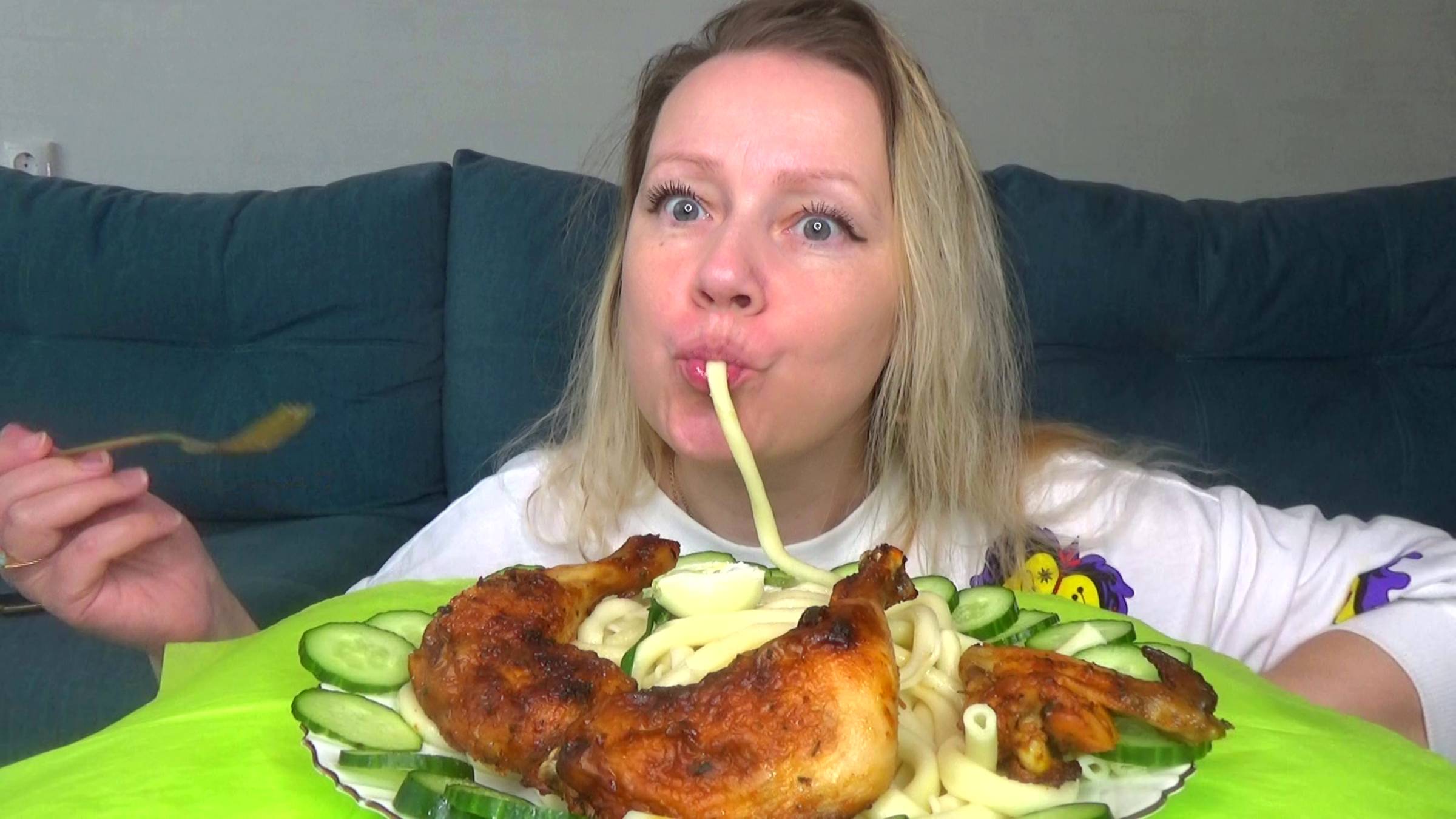 Мукбанг макароны спагетти, ноги и крылышки куриные, зелень, овощи. Еда на камеру.