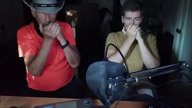 Исполнение песни на губных гармониках. Дуэт с внуком.