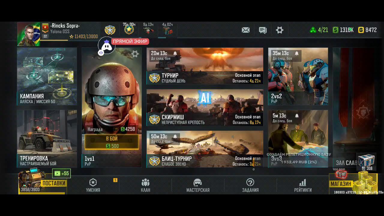 Поддержка автора по ссылке: https://www.donationalerts.com/r/rincks райффазен банк 2200 3005 1695 5281 телеграм группа для подписчиков https://t.me/art_of_war_3_rincks_sopra Продлить стрим:300 руб Смена фракции:200 руб Тренировка:300 руб 2х2: по совести Покажи кач: миллион рублей Закончить стрим:1000 руб Так же можно заказать челлендж. тоесть дать стримеру задание за определенную сумму. Например: сыграть только авиацией или вообще без неё,ну и так далее. Ссылка на игру: Долго искал настоящую стратежку на телефон, как старкрафт. Наконец нашел Art of War 3! Очень крутая игра! Вот ссылка, качай, тебе понравится: https://redirect.appmetrica.yandex.com/serve/169878688668608468?recruiter_id=1111515909