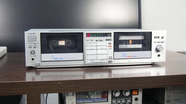 На видео воспроизводится очень старая запись. 編集機能を充実したダブルカセットデッキ。 最高15曲までランダム予約が可能なランダムメモリー選曲機構を搭載しています。これにより好みの曲を好みの順番で再生でき、さらに曲間を4秒ずつ取りながら編集できるランダムダビング編集およびランダム再生を実現しています。 ワンタッチ操作のダビングスタートボタンを採用しており、ワンタッチでテープ1とテープ2が同時スタートすることで、タイミングのズレを防いでいます。 ドルビーCタイプを搭載しており、ローディがドルビー回路専用に開発したワンチップICを採用しています。 また、ダビング時にドルビーが2重に働くのを防ぐため、ドルビー自動ON/OFF機構を搭載しています。 テープ1の再生音とマイクまたはラインの音をミキシングし、テープ2に録音できる多重ミキシング録音が可能です。 オートリピート機能により、テープ1とテープ2を交互に8回づつ、合計16回の長時間ロングプレイが可能です。 コンピューターオートRec Mute機構を搭載しています。この機能では、ワンタッチで4秒間の無信号録音部を作ったのち、自動的にポーズ状態となります。 コンピューターメモリーリワインド機構を搭載しています。 ワンアクションタイマーON/OFFスイッチを搭載しています。 タイマーアラート機構を搭載しています。 前後15曲の頭出しが可能なDRPSや、テープの最初から何番目の曲かを指定するだけでその曲を頭出しするオートDRPSなどを搭載しています。 リーダーテープ早送りメカを搭載しており、録音や再生に不必要なリーダーテープ部を早送りし、スタンバイ状態でストップすることができます。 テープ2は3段テープセレクター、テープ1にはオートテープセレクターを搭載しています。 長時間ロングプレイ機能を搭載しており、テープ1からテープ2へ、またテープ1へと交互に再生することで最長12時間(90分テープx2)の再生が可能です。 通常の操作のほか、テープ1/2切換え、選曲予約が遠隔操作可能なリモコン対応メカニズムとなっています。 型式 ダブルカセットデッキ ヘッド 録再:メタルS.L.(スーパーライフ)ヘッドx2 消去:3ギャップフェライト消去ヘッドx1 モーター 電子制御DCモーターx2 ワウ・フラッター 0.04%(WRMS) ±0.09%(W・Peak) 周波数特性 20Hz~18kHz/30Hz~16kHz ±3dB(メタル) 20Hz~18kHz/30Hz~16kHz ±3dB(クロム) 20Hz~17kHz/30Hz~15kHz ±3dB(ノーマル) SN比(メタルテープ) 3%歪レベル、聴感補正: 74dB(Dolby C NR on) 66dB(Dolby B NR on) 58dB(Dolby NR off) EIAJ: 68dB(Dolby C NR on) 62dB(Dolby B NR on) 54dB(Dolby NR off) 入力感度/インピーダンス Line in:80mV/50kΩ以上 Mic:0.4mV/300Ω~5kΩ(適合) 出力インピーダンス(負荷) Line out:50kΩ以上 Headphone:8Ω~2kΩ 電源電圧 AC100V、50Hz/60Hz 消費電力 24W 外形寸法 幅435x高さ110x奥行279mm 重量 6kg 付属 USピンコードx2 ヘッドクリーニング棒