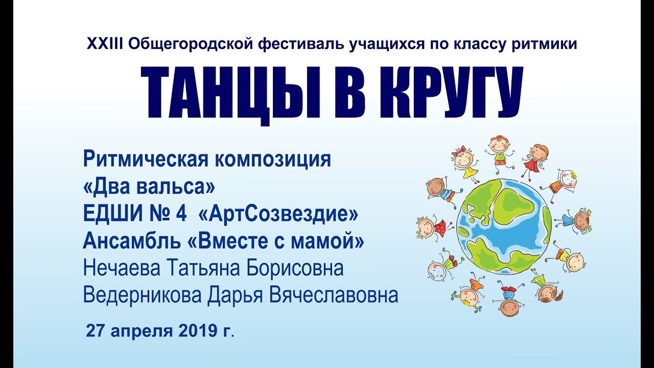 Танцевальная композиция «Два вальса» ЕДШИ № 4 «АртСозвездие» ансамбль «Вместе с мамой» Нечаева Татьяна Борисовна Ведерникова Дарья Вячеславовна XXIII Общегородской фестиваль учащихся школ искусств «ТАНЦЫ В КРУГУ» «КАЛЕЙДОСКОП РИТМОВ» 27 апреля 2019 года