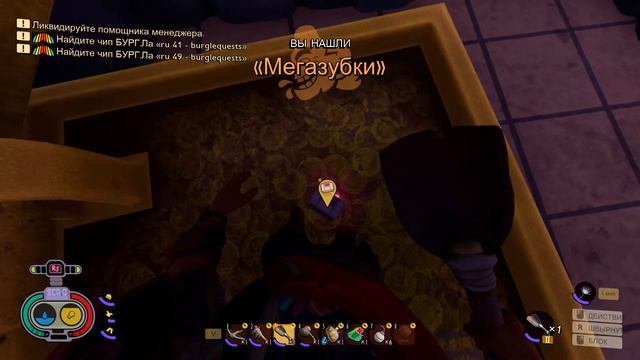 Проложили правильный путь на стол, строим крепление для канатной на столе. Пошли за ключом от сундука на столе и открыли его. Залезли в банку с зубом и застряли там. Отдали чип БУРГ.Лу и проанализировали грибной кирпич. Проверяем канатную дорогу на стол.