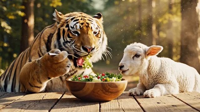 Хищник и травоядное за одним столом. Встречайте: ТИГР-ВЕГЕТАРИАНЕЦ И ЕГО ЛУЧШИЙ ДРУГ — овца, которая подаёт салат. 🥗 Тигр жуёт морковку. Овца подкладывает помидорки. Никаких охот — только уют, салфетки и свежие овощи. Кто бы мог подумать, что они станут соседями по столу? ⚡ Смотри до конца — тигр просит добавки! А ты? Кого посадить за обеденный стол в следующем видео? Пиши в комментариях! 👇 Самые тёплые идеи мы накрываем на стол первыми. ✍️🥕 #ЗверскаяСтоловая #ТигрИОвца #ОбедСХищником #ТигрВегетарианец #Салат #ДружбаЖивотных #Милота #Животные #Shorts #ЧтоСМешать #НапишиНам