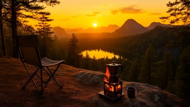 Вечерний кофе в горах. Закат с видом на озеро.