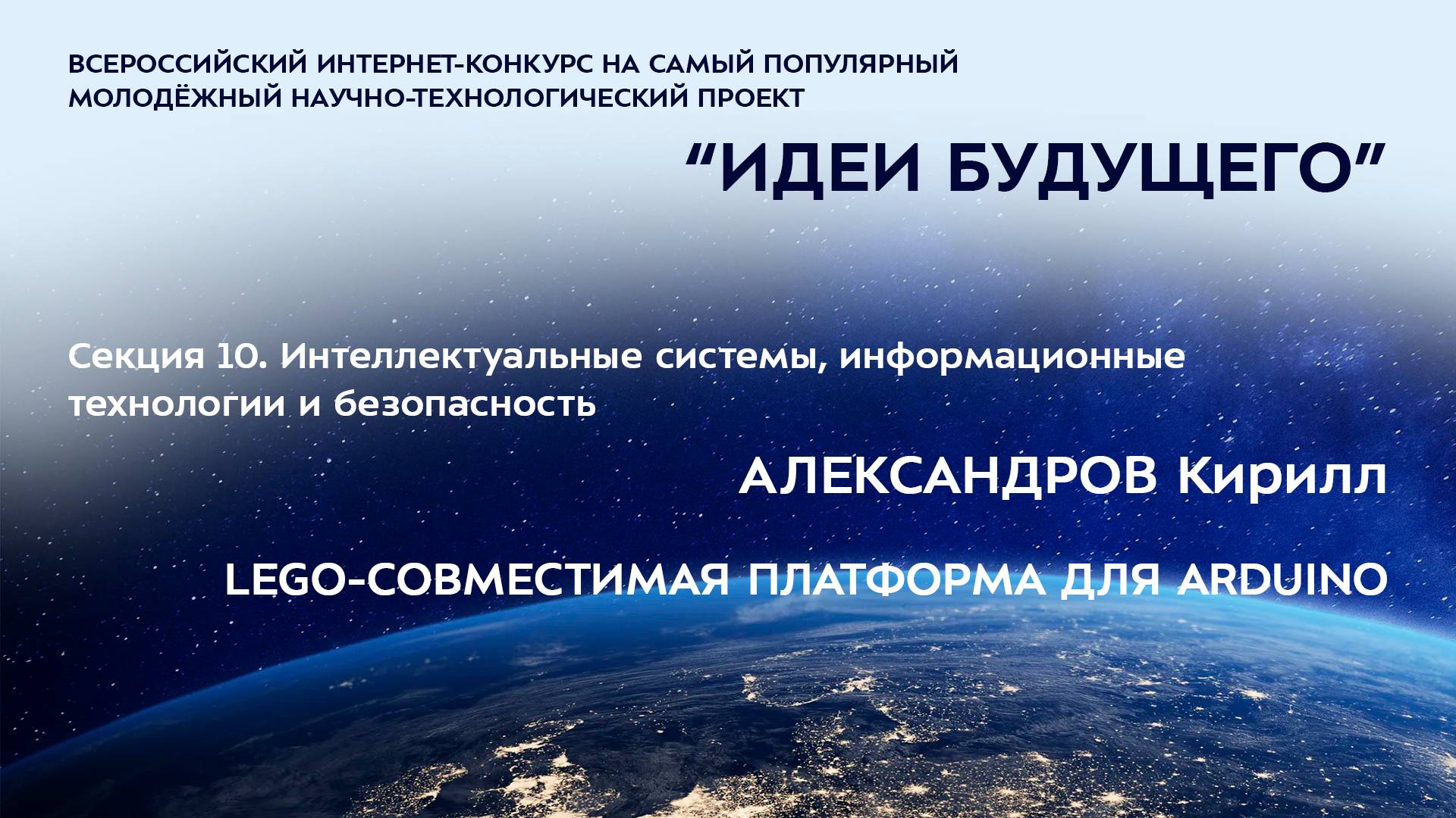 (10-4) АЛЕКСАНДРОВ Кирилл Владимирович Забайкальский край, г. Борзя МОУ «Средняя общеобразовательная школа № 240 г. Борзи», 7 класс LEGO-СОВМЕСТИМАЯ ПЛАТФОРМА ДЛЯ ARDUINO Научный руководитель: Моргачев Роман Анатольевич, Забайкальский край, город Борзя, МОУ «Средняя общеобразовательная школа № 240 г. Борзи», техник Более подробно о мероприятиях Программы "Шаг в будущее" можно узнать на сайтах http://www.step-into-the-future.ru/ и http://шагвбудущее.рф Мероприятия проводятся при поддержке Фонда президентских грантов