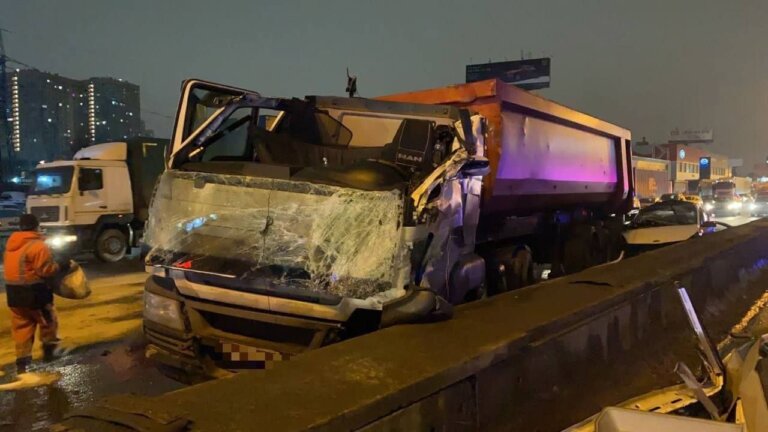 Грузовой автомобиль столкнулся с такси и врезался в столб на МКАД. Водитель погиб
