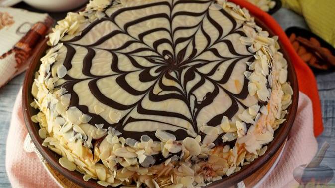 Известный венгерский десерт, состоящий из миндально-шоколадных коржей, пропитанных масляно-заварным кремом. Украшен торт глазурью с рисунком в виде тёмных линий и миндальными лепестками. #ТортЭстерхази #МиндальныеКоржидляТорта #Масляно-ЗаварнойКрем #ГлазурьПайтинкадляТорта #ТортМиндальный