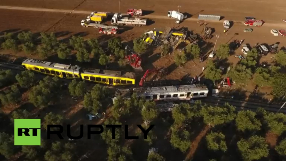 Беспилотник заснял последствия столкновения двух поездов в Италии