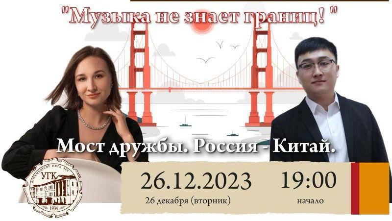 Концерт вокальной музыки Мария Курочкина (сопрано) Шанхай. КНР - Екатеринбург. Россия. Лю Чжэнь (тенор) Екатеринбург. Россия - Вэйфан, провинция Шаньдун,КНР. Концертмейстеры: Лауреаты всероссийских и международных конкурсов доцент Людмила Банцевич, Наталья Анисимова В программе арии, дуэты и романсы зарубежных и русских композиторов. Ведущие концерта - Ван Яньсун и Дарья Орликова Медиа - Лев Портнягин