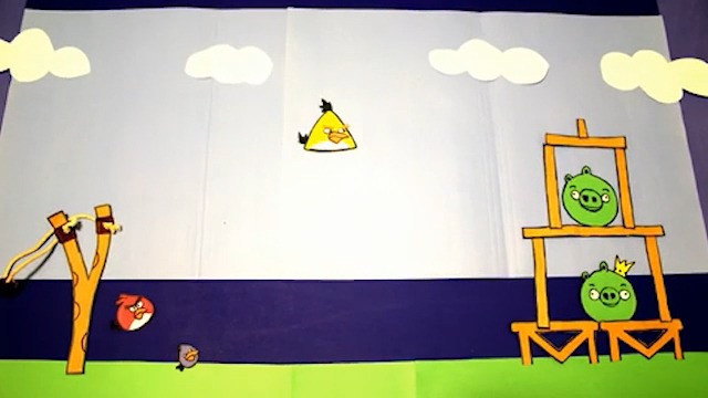 Стоп-моушен анимация, повторяющая один из уровней игры Angry Birds, созданная из бумаги.