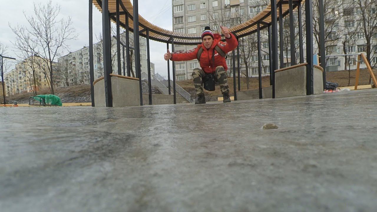 Ледяной сквер на Добровольского 5А.Опробовал в сквере новые турники и брусья