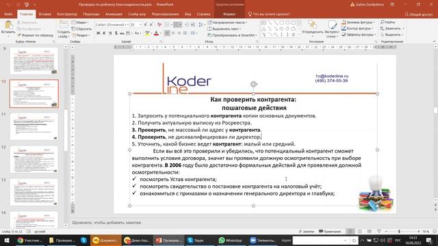 Компания «Кодерлайн» провела вебинар «Проверка по рейтингу благонадежности (на примере 1С:ERP)» Ведущая: Гардышева Галина - консультант-аналитик 1С:ЕRP Целевая аудитория для бухгалтеров, пользователей и специалистов ИТ-подразделений компаний различных отраслей. Описание В этом году более пристальное внимание банки и контролирующие органы будут уделять проверке организаций на благонадежность. Что такое рейтинг благонадежности, кто и как его будет применять, чем это грозит и как подстраховаться? Как защититься в такой ситуации и чем может помочь программное обеспечение от 1С мы рассмотрим на примере 1С:ERP 2.5. Разберем на примерах дополнительные сервисы, которые предусмотрены в 1С, как использовать их и сторонние ресурсы, оформить первичку в программе и как проявить «должную осмотрительность, чтобы минимизировать риски. Программа 1. Что такое платформа для банков «Знай своего клиента», как она повлияет на рейтинг 2. Как проверить контрагента, на что обратить внимание 3. Как доказать налоговой, что Ваше предприятие проявило должную осмотрительность. 4. Как ее действительно проявить 5. Какие ресурсы использовать и что есть для этого в 1С:ERP.