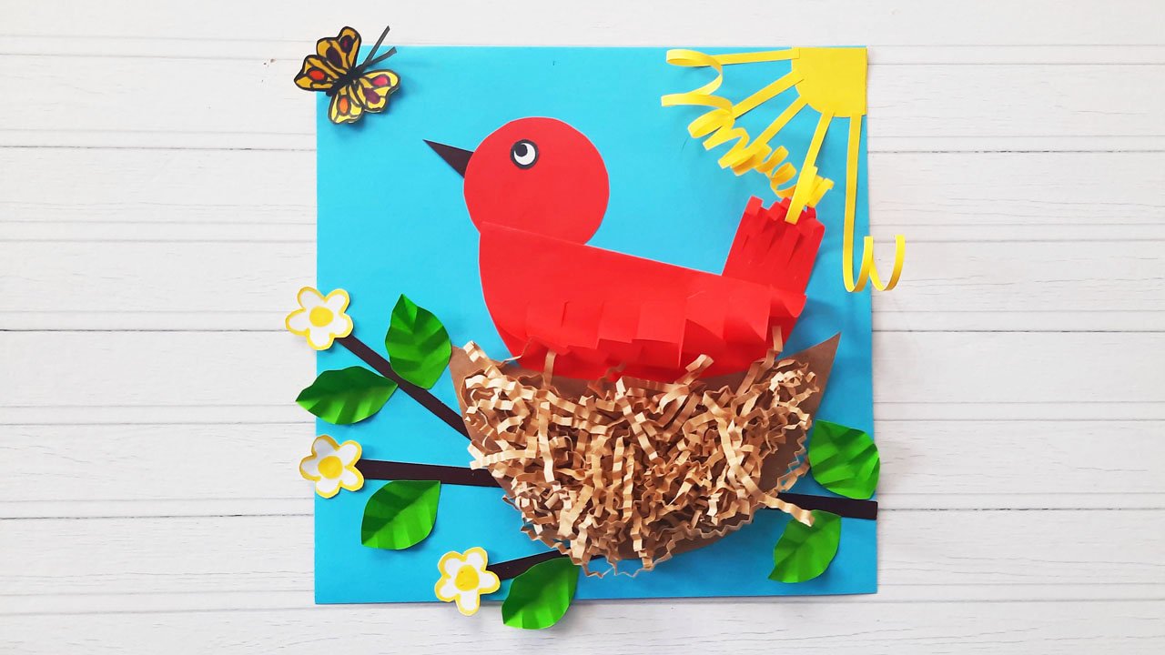 Поделка ко Дню птиц своими руками. Аппликация птичка в гнезде из бумаги.