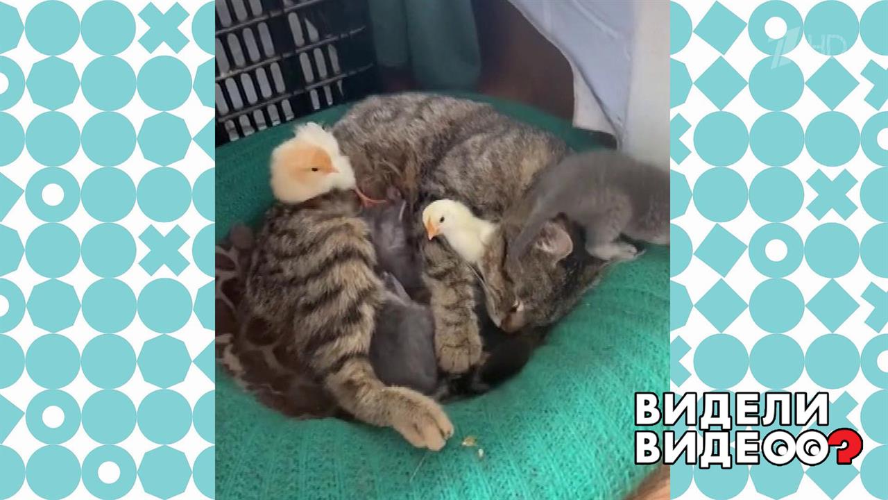 Кошка Мурка приняла маленьких цыплят, как родных.