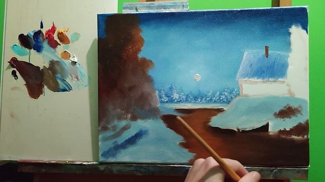 "Зимняя ночь"как нарисовать зимний пейзаж ночью,как рисовать дом,для самых начинающих #art #пейзаж