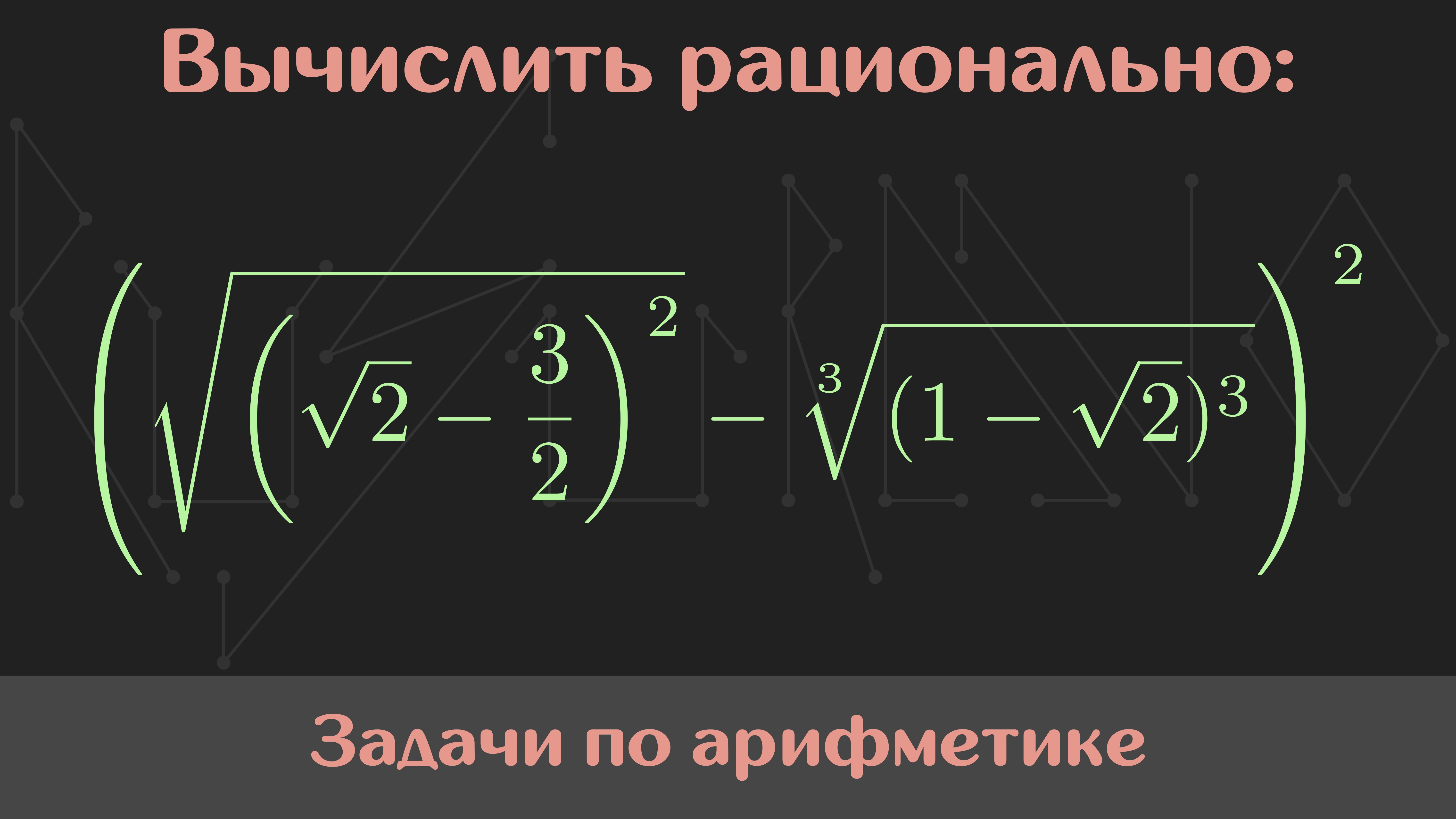 Мой курс по арифметике: https://stepik.org/a/195543 Условие: Вычислить наиболее рациональным способом: (√((√2 - 3/2)²) - ∛((1-√2)³))² Памятка: перед просмотром решения задания обязательно попробуйте решить задачу самостоятельно. Так вы научитесь вырабатывать собственный подход к решению. Музыка: Nomyn — Moonlight #Сканави #Арифметика #РешайСоМной #Математика