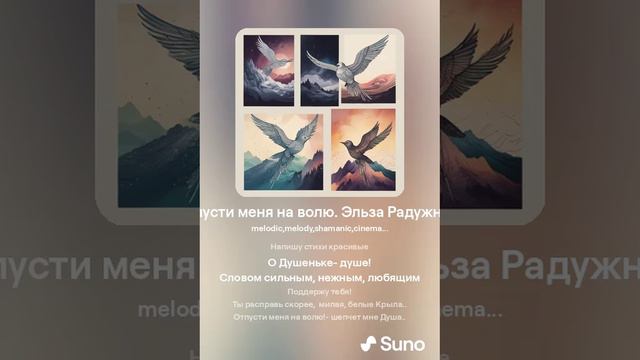 На стихи Эльза Радужная версия песни 2. Отпусти меня на волю!- шепчет мне Душа.. -Там, где тихо и привольно , там где Свет всегда! Буду там я Вольной Птицей виться в Небесах.. Буду я Свободной, сильной..то - Мечта моя!.. Вся в тенётах и обмане, Связаны Крыла.. Вся в сомнениях и боли Как взлететь со дна? Океаны слов ненужных, Водопады лжи.. Я хочу быть вольной Птицей, С небушком дружить! Отпусти меня на волю!- шепчет мне Душа.. -Там, где тихо и привольно , там где Свет всегда! Буду там я Вольной Птицей виться в Небесах.. Буду я Свободной, сильной..то - Мечта моя!.. Так взлетай, скорее, милая, помогу тебе! Напишу стихи красивые О Душеньке- душе! Словом сильным, нежным, любящим Поддержу тебя! Ты расправь скорее, милая, белые Крыла.. Отпусти меня на волю!- шепчет мне Душа.. -Там, где тихо и привольно , там где Свет всегда! Буду там я Вольной Птицей виться в Небесах.. Буду я Свободной, сильной..то - Мечта моя!.. Знаешь что, скажу тебе.. Всё не просто так.. Это время нами выбрано для развития.. Мы летаем, падаем, и опять парим.. Знай, моя прекрасная, у нас много сил! Отпусти меня на волю!- шепчет мне Душа.. -Там, где тихо и привольно , там где Свет всегда! Буду там я Вольной Птицей виться в Небесах.. Буду я Свободной, сильной..то - Мечта моя!.. А печали и сомнения..ну, а как без них?