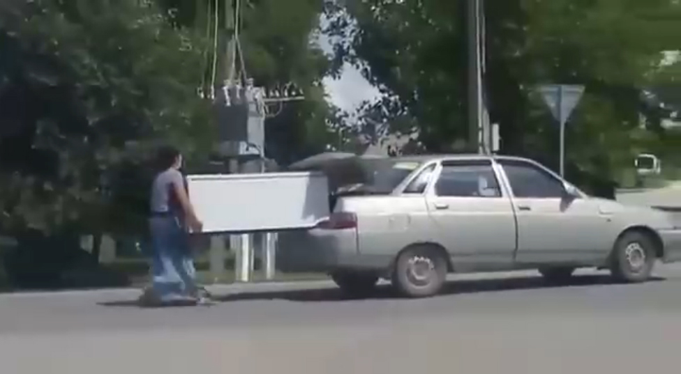 Женщина поддерживает холодильник, который торчит из багажника авто. #прикол #россия #рашка #перевозка