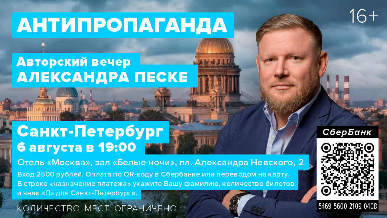 Авторский вечер Александра Песке. Москва, 4 августа в 19:00. Актавест Hall, Средний Тишинский переулок 8. Вход 2500 рублей. Оплата переводом на карту Сбербанка 5469 5600 2109 0408. В строке "Назначение платежа" укажите Вашу фамилию, количество билетов и знак "М" для посещения авторского вечера в Москве. Вход с 18:00 по фамилиям. Санкт-Петербург, 6 августа в 19:00. Отель "Москва", зал "Белые ночи", по. Александра Невского 2. Вход 2500 рублей. Оплата переводом на карту Сбербанка 5469 5600 2109 0408. В строке "Назначение платежа" укажите Вашу фамилию, количество билетов и знак "П" для посещения авторского вечера в Москве. Вход с 18:00 по фамилиям.