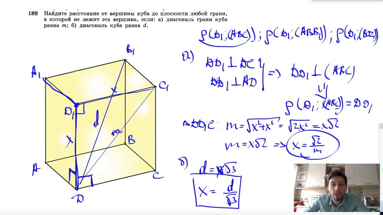 №189. Найдите расстояние от вершины куба до плоскости любой грани, в которой не лежит эта вершина, если: а) диагональ грани куба равна m; б) диагональ куба равна d. Поддержать канал рублём - 5469400944002125 (Сбербанк) Мой второй канал для подготовки к ЕГЭ и ОГЭ - https://www.youtube.com/ЕвгенийСумин Инстаграм - https://www.instagram.com/EGE_OGE.math Личный инстаграм - https://www.instagram.com/ee_sumin VK - https://vk.com/evgeniysumin FB - https://www.facebook.com/EvgeniySumin