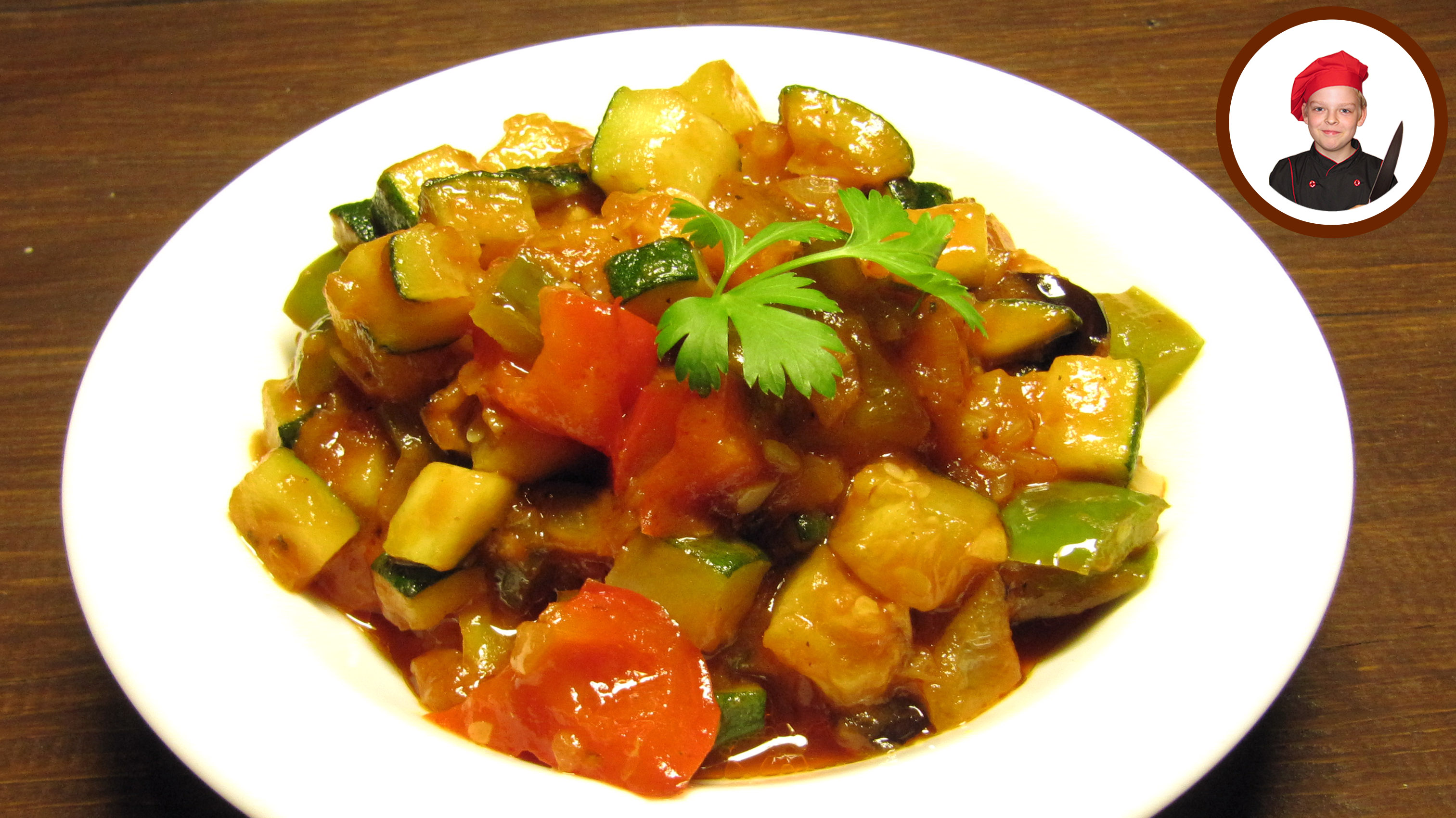 Рататуй домашний. Это французское блюдо из свежих овощей. Чем-то напоминает лечо или овощное рагу. Рецептов рататуя большое множество. Я старался приготовить рататуй по классическому рецепту. Ингредиенты: - Баклажан - 1 шт. - Кабачок цукини - 1 шт. - Перец сладкий - 1 шт. (либо разных цветов по 1/3 каждого цвета) - Лук репчатый - 1 шт. - Чеснок - 3 зубчика - Томатная паста - 4 столовые ложки - Масло оливковое (или растительное) - 5-6 столовых ложек; - Вода - 50 мл. - Соль по вкусу - Прованские травы - по вкусу и по желанию: - Мята - Базилик - Тимьян - Фенхель и др. #рататуй #рецепты #Апухтин #кулинария