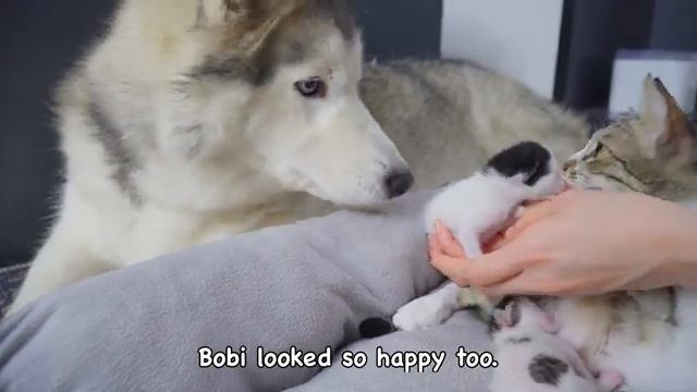Хаски впервые встречает новорождённых котят и сразу же становится их нянькой - 2025 год